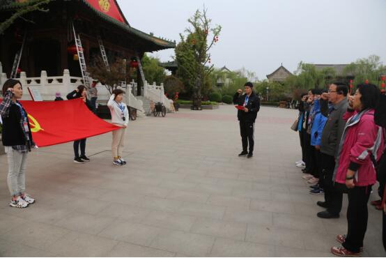 在复兴楼现场教学点,全体党员在这块抗战圣地面对党旗,重温入党誓词,高举伟大旗帜,努力做一名敢于担当、清正廉洁的共产党员。