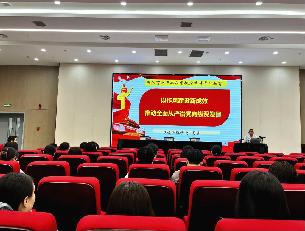 为扎实推动深入贯彻中央八项规定精神学习教育走深走实,持续深化作风建设,推进全面从严治党,2025年4月10日下午经济管理学院党总支书记马勇以“以作风建设新成效推动全面从严治党向纵深发展”为题,为学院全体党员讲授专题党课。