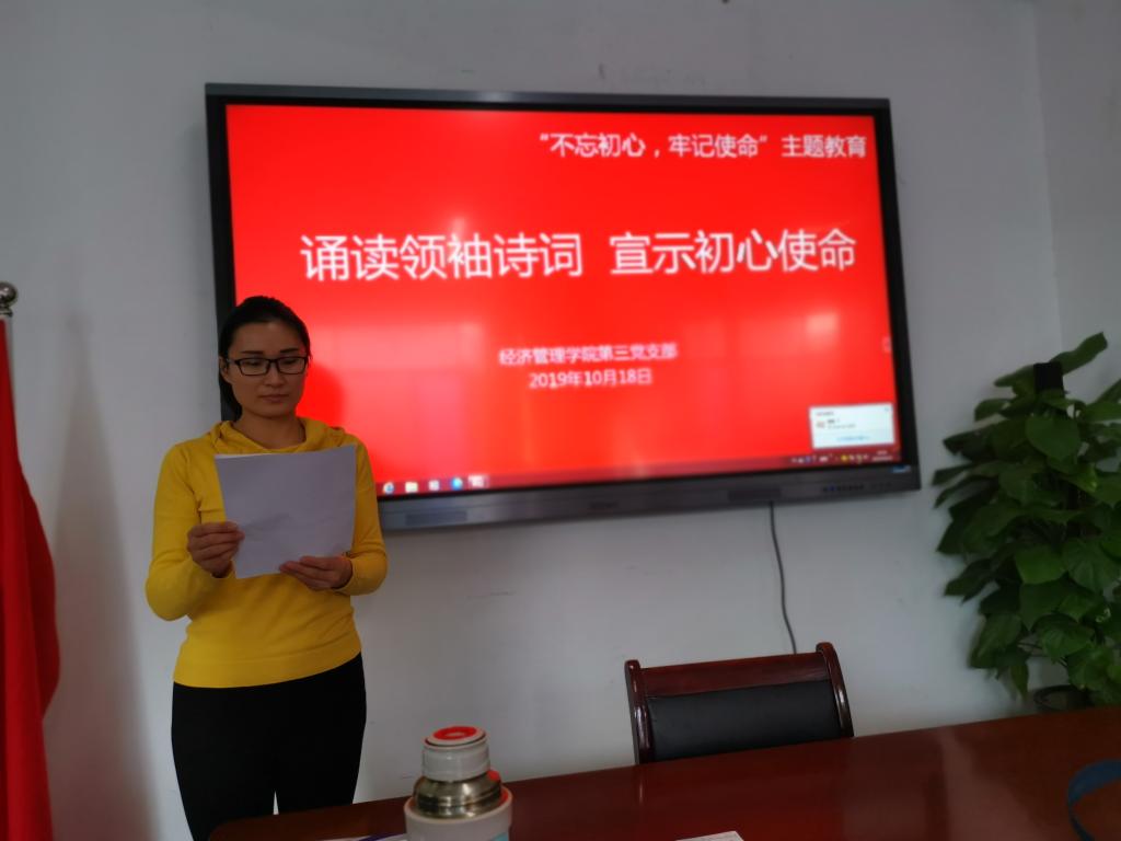 “ 孩儿立志出乡关,学不成名誓不还。埋骨何须桑梓地,人生无处不青山。”一声声饱含感情的诵读,一句句铿锵有力的声音,久久回荡在党建活动室。10月18日下午,为重温红色经典,引导支部党员不忘初心,坚定爱国情怀和政治信仰,经管学院教工第三党支部在党建活动室组织开展了“不忘初心、牢记使命”红色经典诵读主题党日活动。