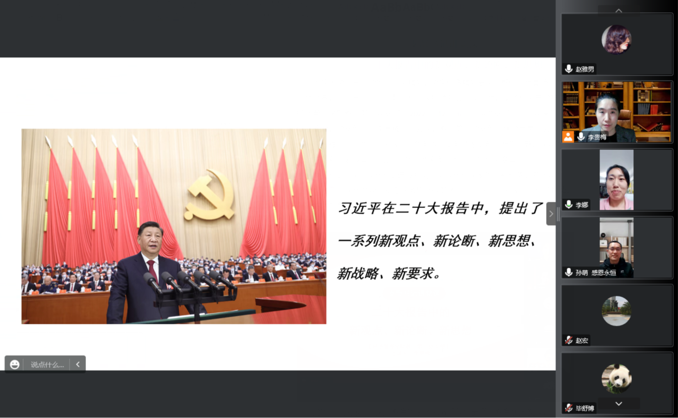 李贵梅同志以“二十大报告中的新观点、新论断、新思想”为题,从党的二十大主题和主要成果、过去五年的工作和新时代十年的伟大变革、马克思主义中国化时代化、中国式现代化、建设社会主义现代化国家的目标任务、坚持党的全面领导和全面从严治党以及应对风险挑战等多个方面对二十大报告进行了解读,同时结合自身学习体会和教师工作实际,为全体党员教师上了一堂主旨鲜明的主题党课。