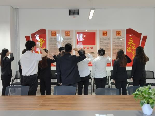 随后,正式党员王晓涵同志作为领誓人,带领新党员们举起右拳,面向鲜红的党旗庄严宣誓。新党员们声音慷慨激昂、铿锵有力,字字誓言饱含着对党的无限忠诚和为党的事业奋斗终身的坚定决心,响彻整个仪式现场,激荡着每一位党员的心灵。