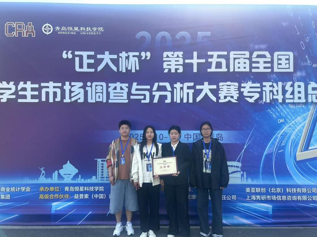 2025年5月10日,经济管理学院传来喜讯。由23级物流管理专业的王奕涵、王志康、王若冰和朱凤朵四名学生组成的代表队,赴青岛参加了“正大杯”第十五届全国学生市场调查与分析大赛专科组总决赛,并凭借扎实的专业素养和出色的现场发挥,一举荣获全国二等奖。这一佳绩不仅是参赛学生个人的荣耀,更充分展现了学院在实践育人领域所取得的丰硕成果。