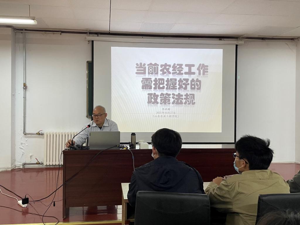 10月27日下午,在齐河校区培训中心五楼培训室,我院邀请了淄博市委党校、淄博讲师团客座教授、山东省农民培训师资库专家、原淄博市农业农村局局长李洪锴作《当前农经工作需把握好的政策法规》讲座。讲座由经济管理学院院长李百秀主持,农林经济管理教研室主任张琳、教师郭良超、刘琦、冯叶及2020级和2021级农林经济管理专业(公费)全体学生聆听了讲座。