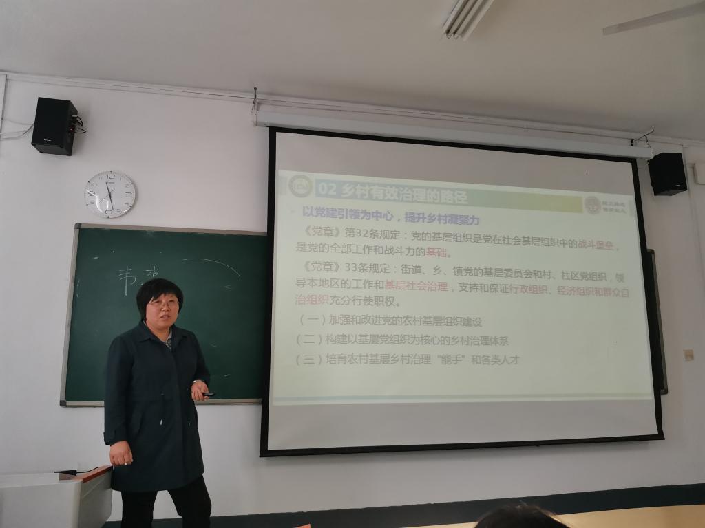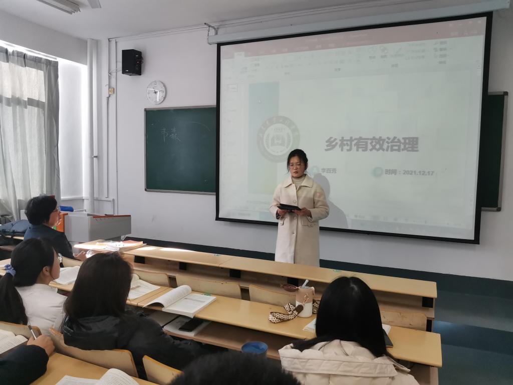 李百秀就乡村治理背景、乡村治理路径及全国乡村治理优秀案例等方面向在座的同学们解读了2019年6月23日中共中央办公厅、国务院办公厅印发《关于加强和改进乡村治理的指导意见》相关政策和实施原则,引导同学们了解山东省关于落实《关于加强和改进乡村治理的指导意见》(2020年2月)20条内容。她通过展示全国乡村治理优秀案例,与同学们一起探讨乡村治理的有效措施:以党建引领为中心,提升乡村凝聚力;区分乡村具体情况,确定治理重点;激发乡村居民治理主体内生力;吸引外来资源助力乡村有效治理。