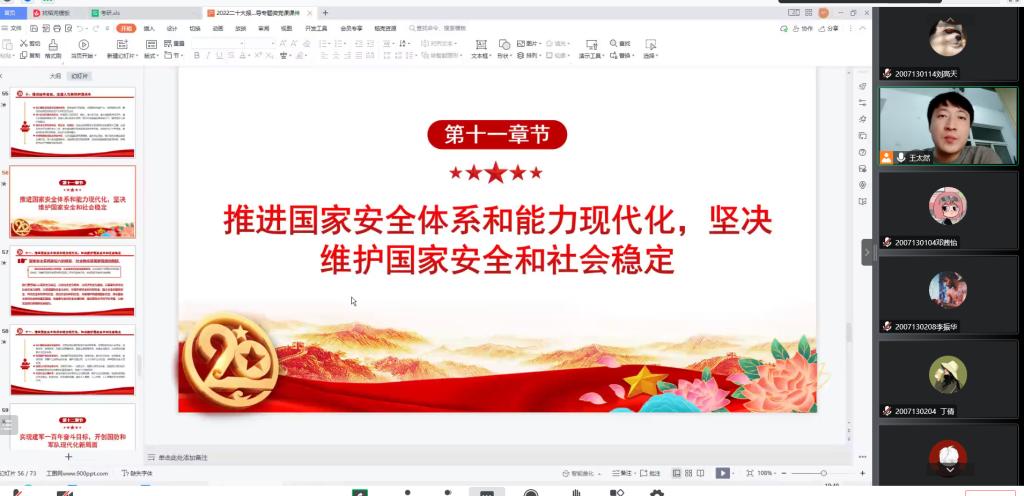 2022年11月29日,经济管理学院党总支书记颜素杰通过腾讯会议为20级金融工程专业、经管专业、物管专业213名同学做《党的二十大精神解读》,政治辅导员王太然通过腾讯会议为20级物流工程专业65名同学宣讲了党的二十大精神,政治辅导员李娜通过腾讯会议为20级农林经济管理专业70名同学作了题为“坚定文化自信,凝聚民族复兴的精神力量”的报告。