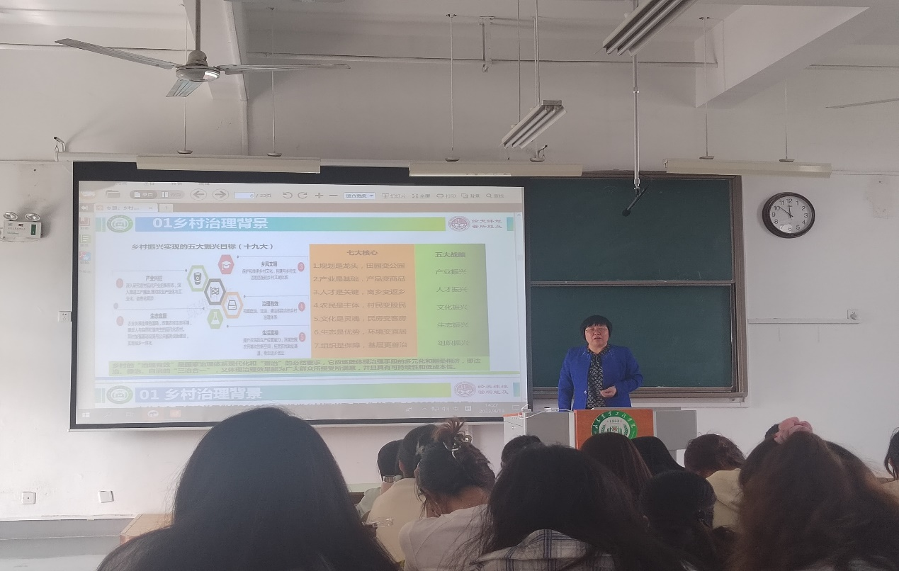 2023年4月17、18日,经济管理学院李百秀教授分别在济南1号教学楼501和齐河校区2号教学楼601为200多名同学作《乡村治理的有效途径》讲座。