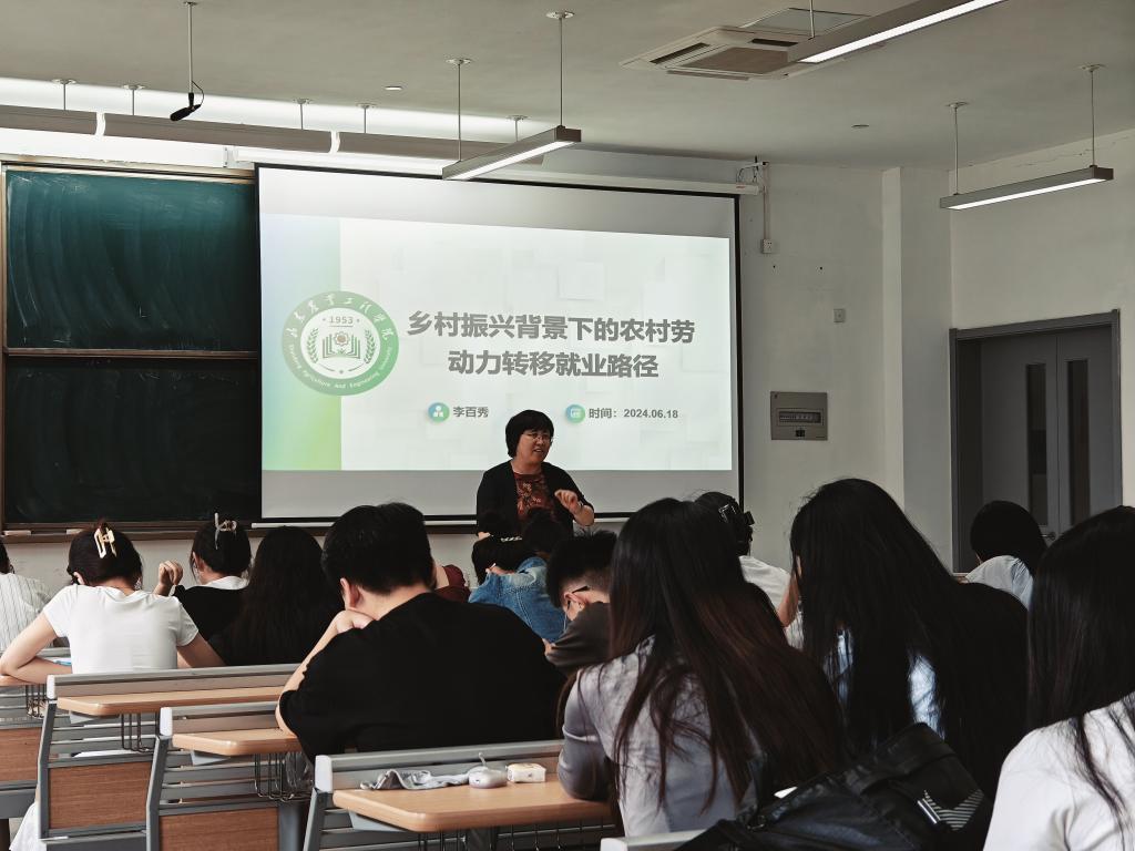 2024年6月18日下午,李百秀教授在淄博教学楼北203室作了《乡村振兴背景下农村劳动力转移的途径》专业讲座,21级95名同学聆听本次讲座。