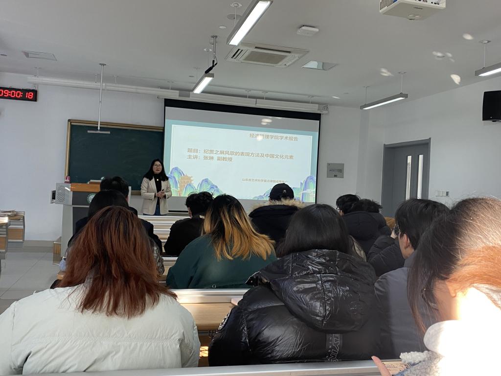 2024年12月3日上午,经济管理学院副教授张琳在淄博校区公教北楼B405做了题为《纪贯之屏风歌的表现方法及中国文化元素》的学术讲座,2022级和2023级农林经济管理专业部分学生参加。