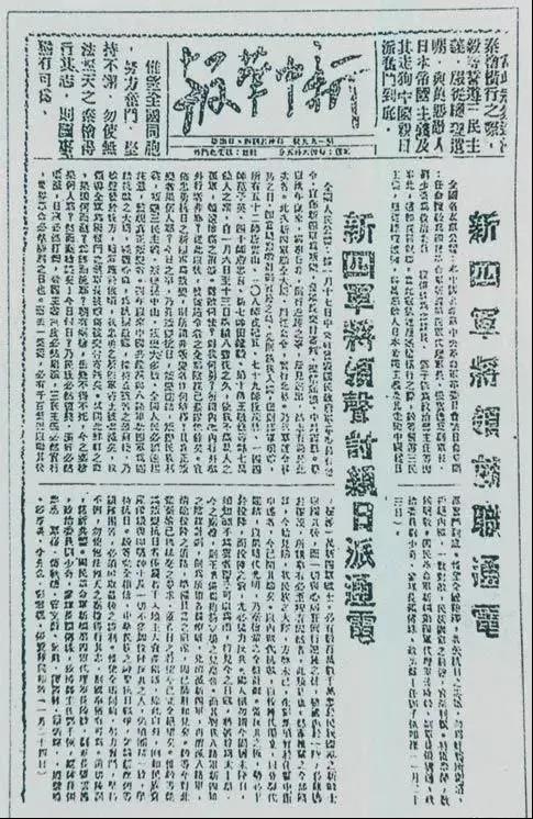 1941年1月23日《新中华报》载新四军将领就职通电和声讨亲日派通电。