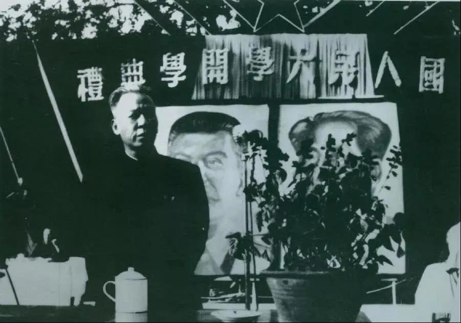 1950年1月23日,刘少奇签发中共中央关于成立中国人民大学的决定。10月,中国人民大学正式开学。图为刘少奇在开学典礼上讲话。