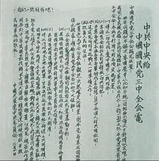 中共中央致电国民党五届三中全会,提出五项要求:停止内战,一致对外;保障言论、集会、结社的自由,释放一切政治犯;召开各党各派各界各军的代表会议,集中全国人才,共同救国;迅速完成对日作战的一切准备工作;改善人民生活。电文指出,如果国民党将上述五项要求定为国策,中国共产党愿实行如下四项保证:停止武力推翻国民党政府的方针;工农政府改名为中华民国特区政府,红军改名为国民革命军;特区实行彻底民主制度;停止没收地主土地的政策,坚决执行抗日统一战线的共同纲领。15日,在国民党的五届三中全会上,宋庆龄、何香凝、冯玉祥等为响应中国共产党关于国共合作,联合抗日的建议,提出关于恢复孙中山所制定的联俄、联共、扶助农工三大政策紧急议案。