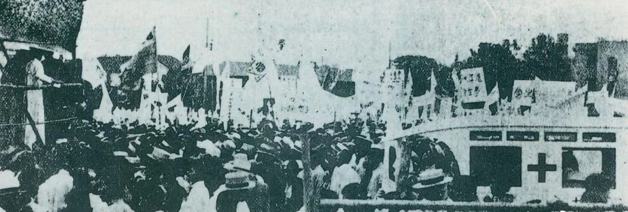 1925年6月7日,中国共产党通过上海总工会联合上海学生联合会、上海各马路商界联合会等,成立了上海反帝运动的领导机关——工商学联合会。11日,在该会的主持下,上海20万群众集会,通过了逞凶、赔偿、取消领事裁判权等17项对外交涉条件。图为大会盛况。