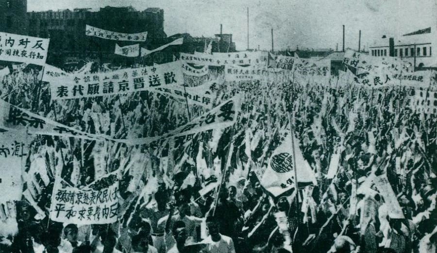 1946年6月23日,上海各界5万余人在北火车站广场召开欢送赴南京请愿代表的大会,呼吁和平,反对内战,并举行了示威游行。