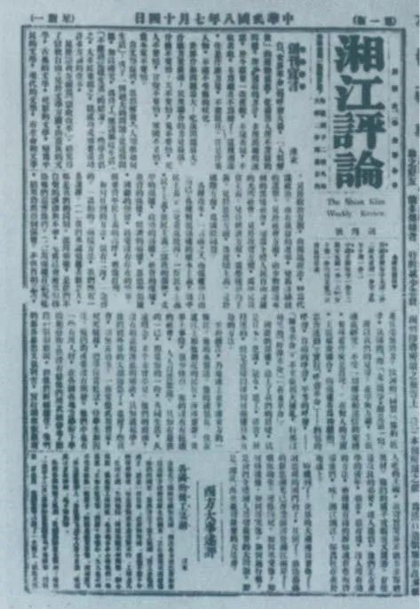 《湘江评论》创刊。毛泽东在《湘江评论》创刊宣言中指出:“世界什么问题最大?吃饭问题最大。什么力量最强?民众联合的力量最强。”《湘江评论》创刊号寄到北京后,李大钊给予了高度评价。《晨报》也予以介绍,说它“内容完备”“魄力非常充足”。