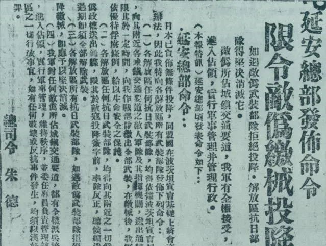 1945年8月10日,朱德发布命令,限令日伪军缴械投降。图为当时的报道。