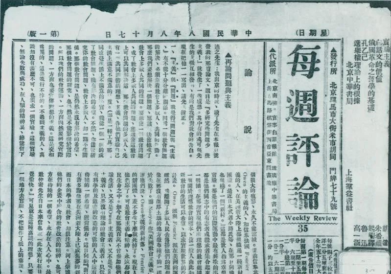 1919年8月17日,李大钊在《每周评论》第35期发表《再论问题与主义》一文,对胡适的观点作了严正的批驳。