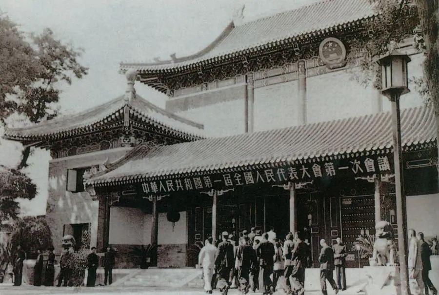 1954年9月15日至28日,中华人民共和国第一届全国人民代表大会第一次会议在北京中南海怀仁堂隆重举行。图为代表们步入会场。
