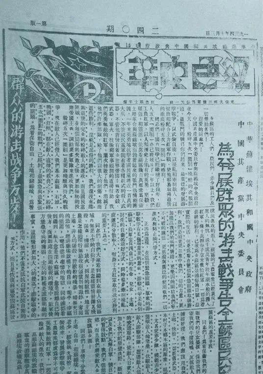 1934年10月,《红色中华》报第240期发表告全苏区民众书,号召发展群众游击战争,保卫苏维埃政权。
