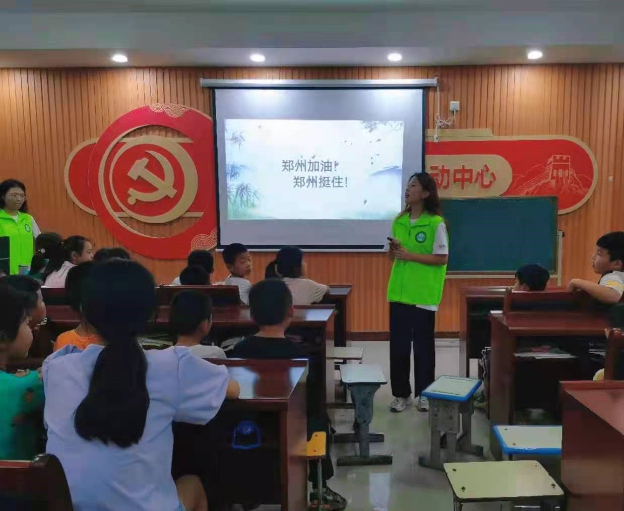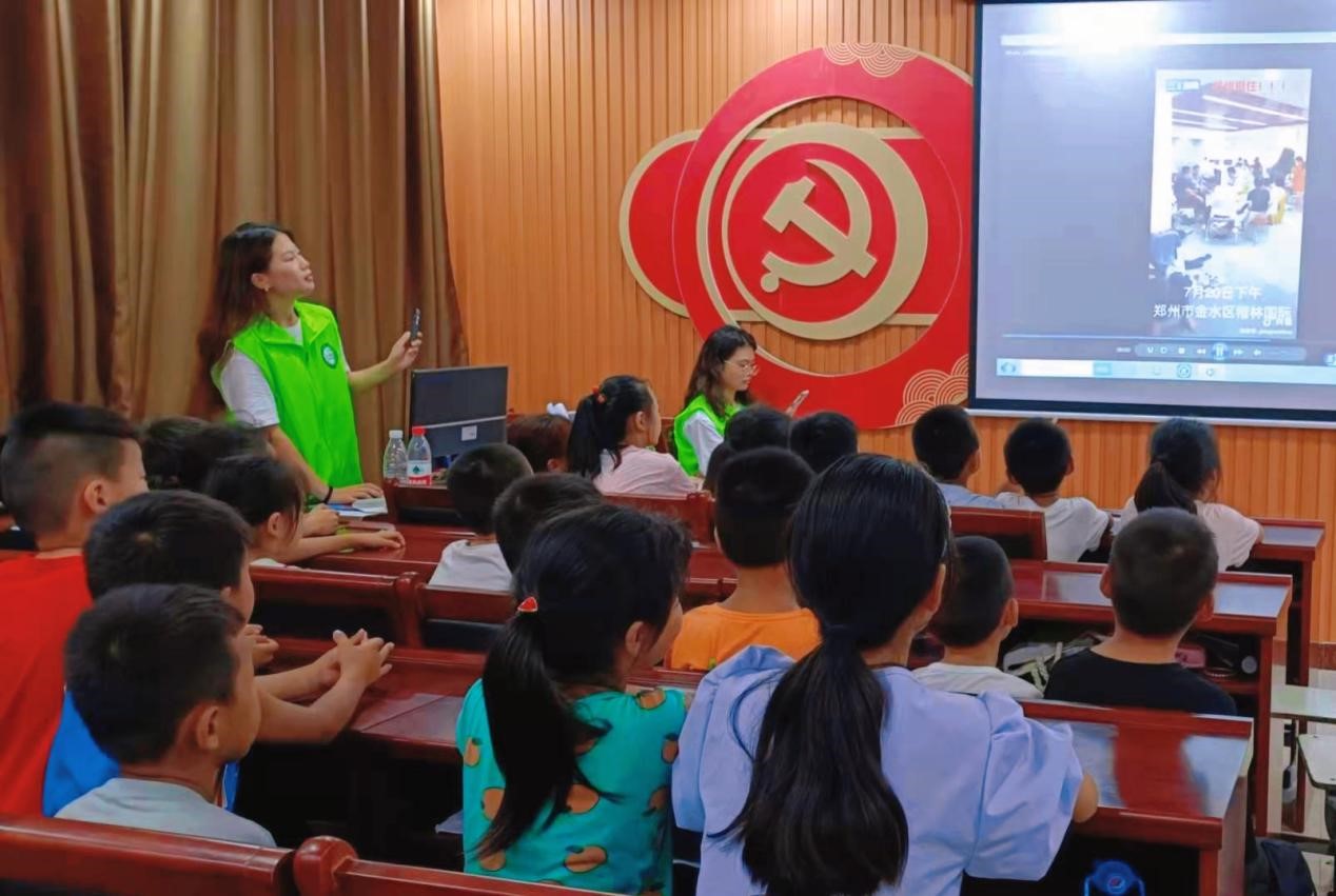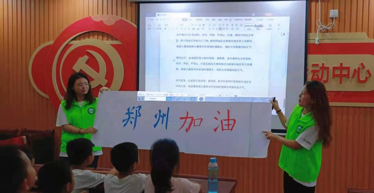 志愿者们给同学们播放了郑州地铁站水淹到成人肩膀的视频以及消防员开着充气船救人的视频,让他们能更直观的感受到郑州人民所经历情况,了解到消防员的辛苦、不易,感受国家在危机时刻“一方有难,八方支援”团结一心的爱国精神。