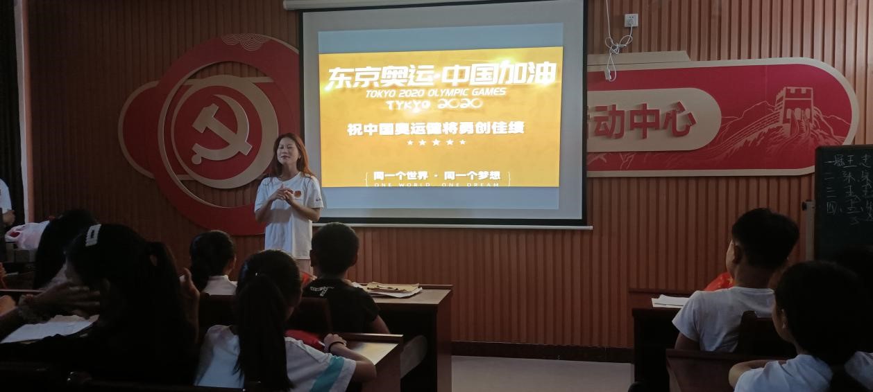 志愿者给孩子们播放了中国队夺金的高燃时刻,让全场的氛围变得火热起来,激发了孩子们为国增光的梦想和爱国之心,增强了民族自信。