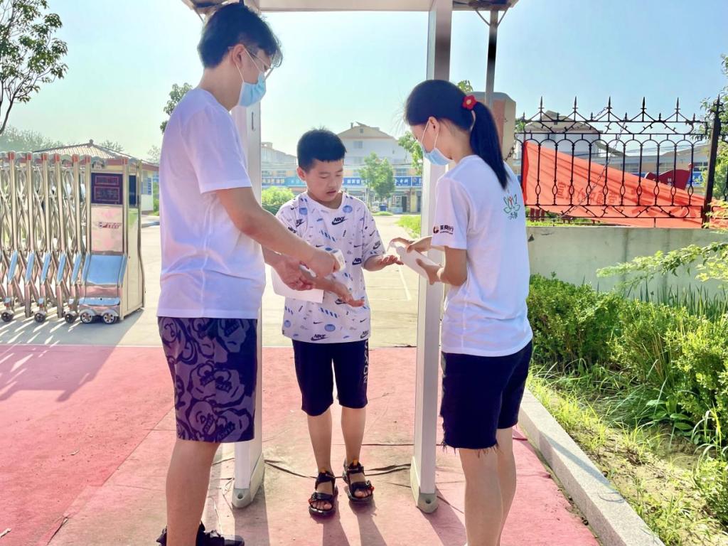 志愿者们在孩子们入校时进行体温检测和消毒,以保证孩子们在疫情期间的安全。