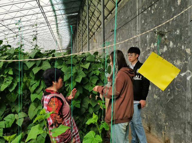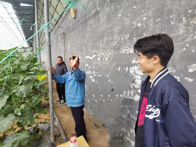队员们到西瓜、豆角、黄瓜大棚询问农作物的长势和种植的注意事项。