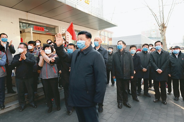 2020年2月10日,中共中央总书记、国家主席、中央军委主席习近平在北京调研指导新冠肺炎疫情防控工作。这是习近平在朝阳区安贞街道安华里社区,了解基层一线疫情联防联控情况。 新华社记者 庞兴雷/摄