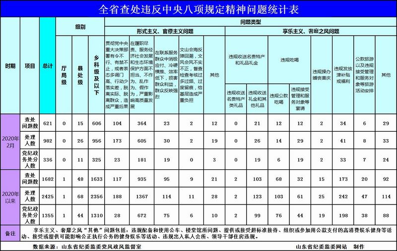 2020年以来,截至2月29日,全省查处违反中央八项规定精神问题情况如下: