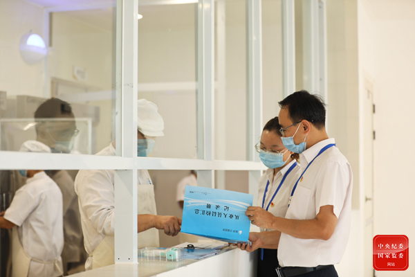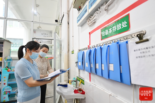四川省德阳市旌阳区纪委监委对全区中小学疫情防控工作开展督查,对问题点位限期整改。图为旌阳区纪委监委督查组对青衣江路小学学生食堂人员疫情防控政策落实情况进行现场督查。(四川省德阳市旌阳区纪委监委 肖妍池 摄)