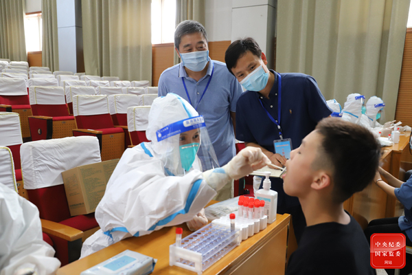 江苏省泗阳县纪委监委围绕校园疫情防控工作强化监督执纪,图为该县纪检监察干部督查中等专业学校疫情防控、核酸检测等工作落实情况。(江苏省泗阳县纪委监委 卢雷雷 摄)