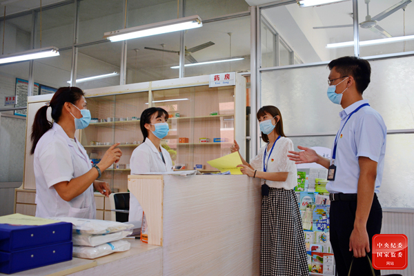 福建省莆田市城厢区纪委监委聚焦校园疫情防控,围绕人员摸排、出入管理、防疫应急预案等重点环节开展监督检查。图为城厢区纪检监察干部在莆田第五中学医务室走访了解疫情防控物资保障情况。(福建省莆田市城厢区纪委监委 林朱平 摄)