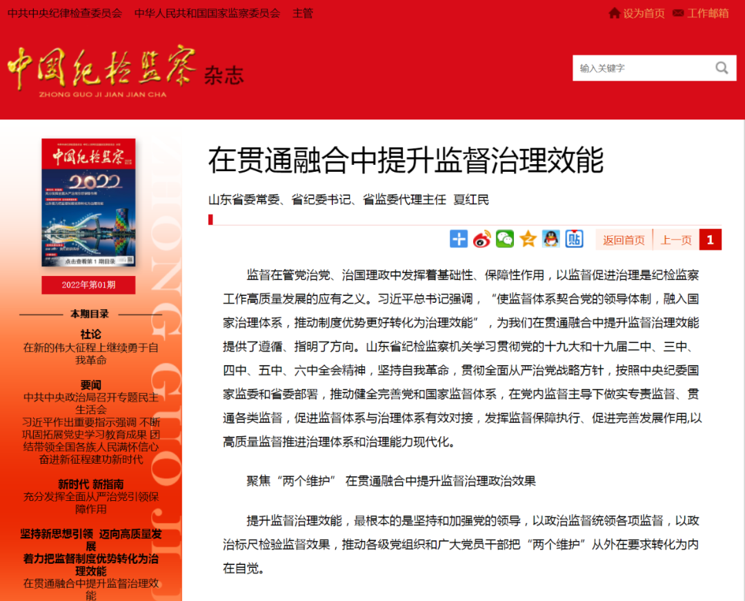 2022年第1期《中国纪检监察》杂志刊发山东省委常委、省纪委书记、省监委代理主任夏红民署名文章:《在贯通融合中提升监督治理效能》。全文如下: