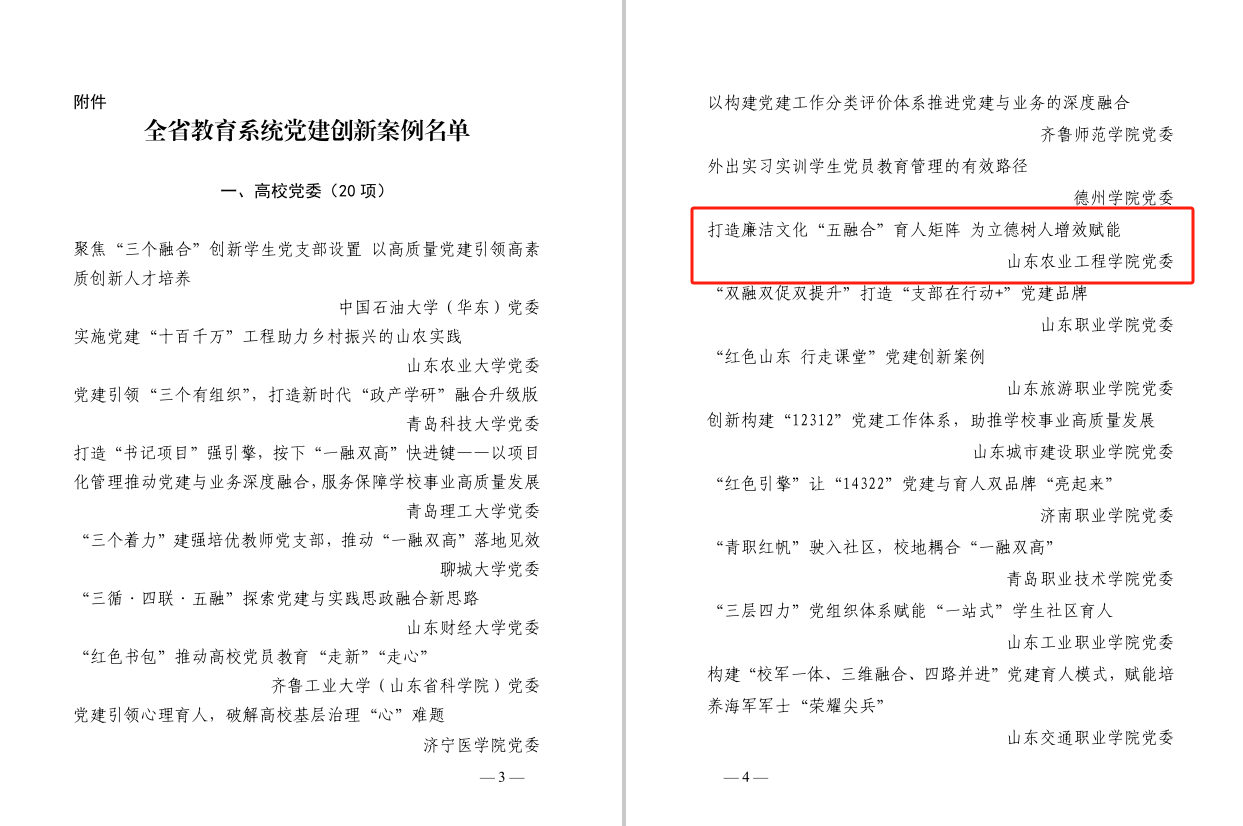 近日,山东省委教育工委公布了全省教育系统党建创新案例名单,必赢申报的《打造廉洁文化“五融合”育人矩阵 为立德树人增效赋能》案例,因鲜明特色、可复制机制和可推广经验获评“高校党委”系列党建创新案例之一(共20项)。