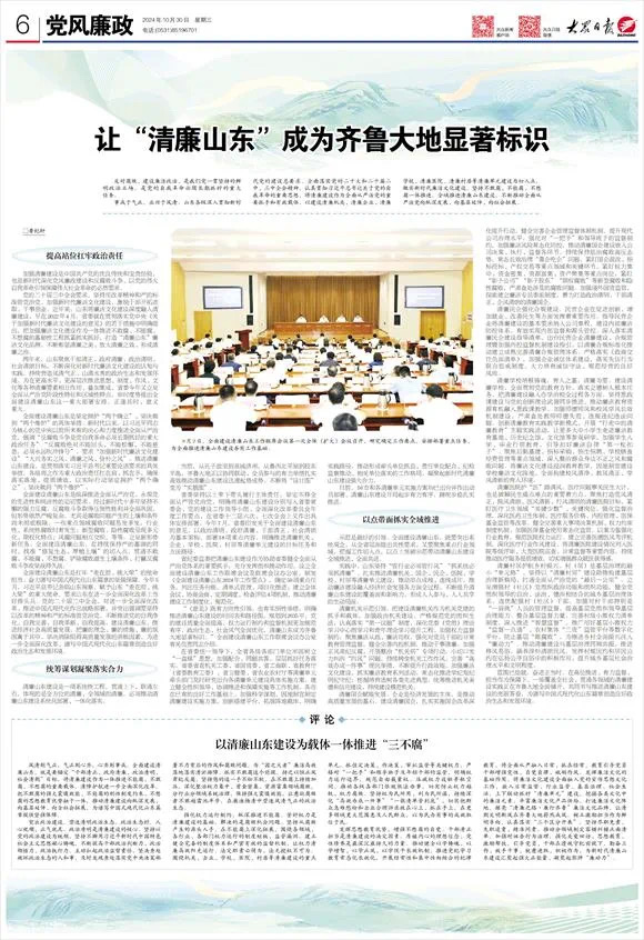 2024年10月30日,大众日报“党风廉政”专版刊发《让“清廉山东”成为齐鲁大地显著标识》。全文如下: