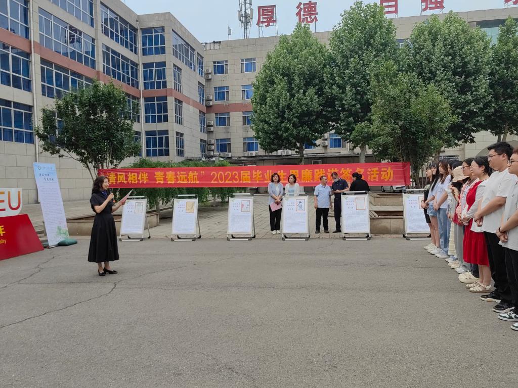 为深入开展学习贯彻习近平新时代中国特色社会主义思想主题教育,全面推进学校廉洁文化建设,5月31日,校纪委联合图书馆开展“清风相伴 青春远航”——2023届毕业生思廉践诺签名活动,赠送毕业廉洁寄语,为青年学子讲好从业道路上的第一堂“青廉课堂”,为他们系好人生廉洁诚信、求思进取的第一粒扣子。校纪委副书记张凌主持了此次活动,校党委委员、纪委书记、山东省监委驻437ccm必赢国际官网监察专员黄晓彦出席活动并致辞,济南校区二级学院负责人、辅导员参加活动。