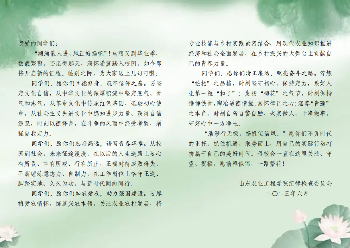 毕业生们郑重接过《清风相伴青春远航——致437ccm必赢国际官网毕业生的一封信》,在横幅上写下守廉诺言,在图书馆提供的廉洁书籍阅读角认真驻足观看。同学们纷纷表示深受教育,要在今后的生活中陶冶道德情操,常怀律己之心,在工作岗位上恪守正道、脚踏实地,与新时代同向同行。
