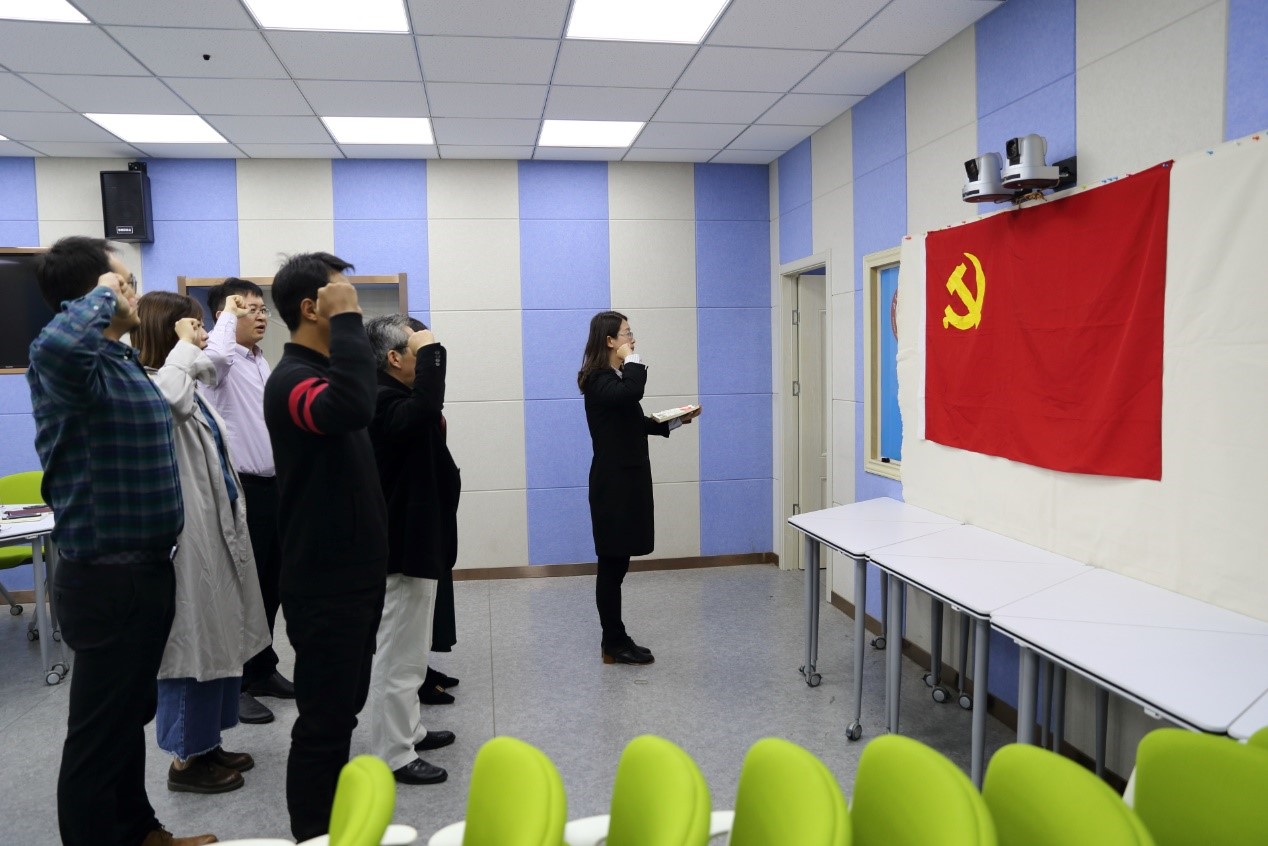 观看影片后,支部党员举行了重温入党誓词活动。党员同志们高举右拳,重温入党誓词,声音铿锵有力,铮铮誓词让每一位党员同志再一次坚定入党之初心,牢记对党的承诺,牢记党员责任和使命。