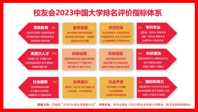 校友会中国大学排名首发于2003年,至今已有21年的历史,已成为具有广泛社会影响力、公信力、参考价值和创新力的中国大学排名领先品牌。校友会2023中国大学一流专业排名评价指标由学科水平、培养质量、师资水平、专业水平和专业影响等5大指标构成,以艾瑞深“大学360度全景数据平台”为数据支持,涵盖700多个体现中国大学办学质量与办学水平的核心评测指标,引导中国大学提升服务国家地方经济社会发展的能力与贡献。