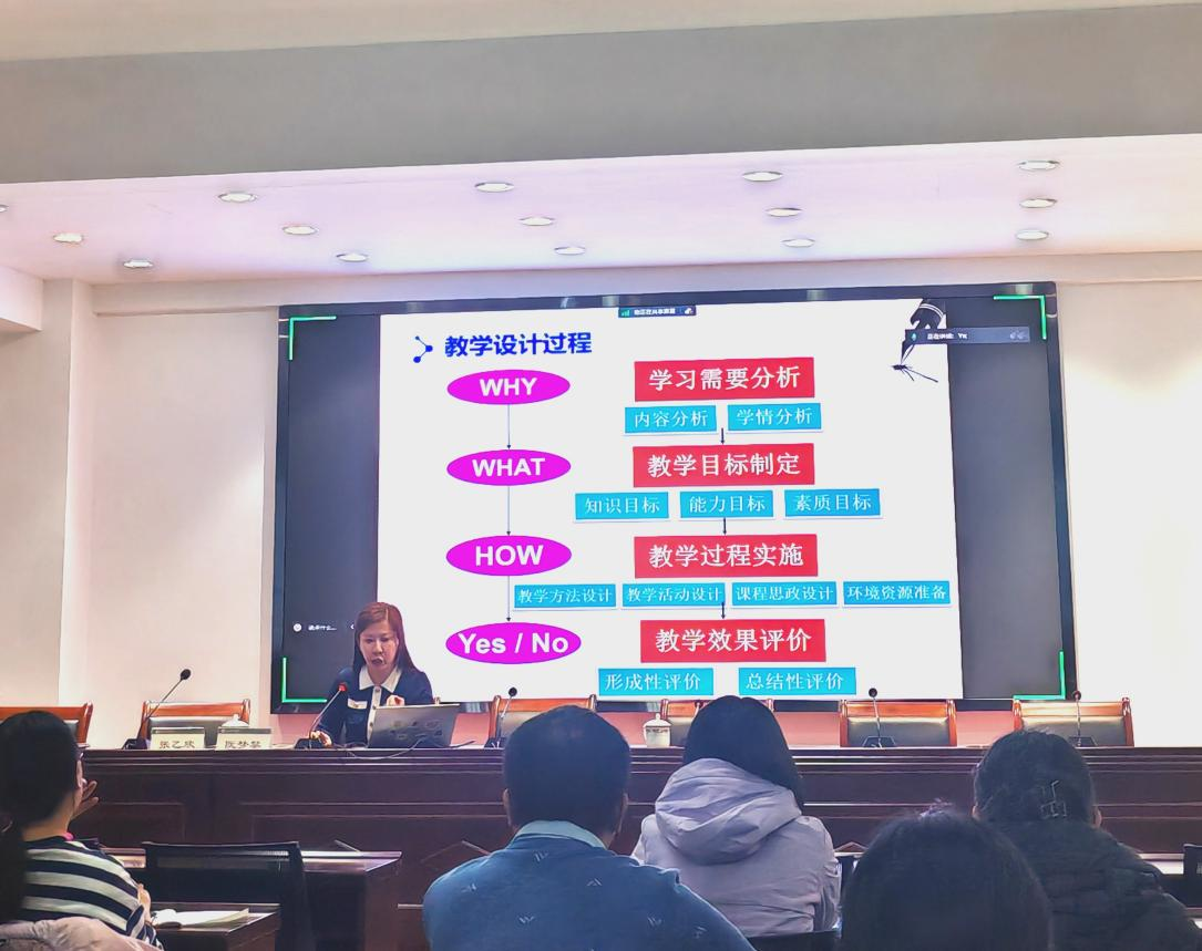 会上,阮教授从自身参赛经历、教学设计的创新和优化手段、教学感悟等方面毫无保留的向大家详细讲述了自身对于如何提高课堂教学能力的思考与体会。阮教授围绕学习需要分析、教学目标制定、教学过程实施和教学效果评价等方面对课程的教学设计过程进行了详细的讲解、分析与探讨。她强调,教学设计要注重高阶性、创新性,课堂教学要重视新知识导入环节与教学评价环节,进一步提高教学质量。最后,阮教授对青教赛教学设计的全方面提出了针对性的建议。