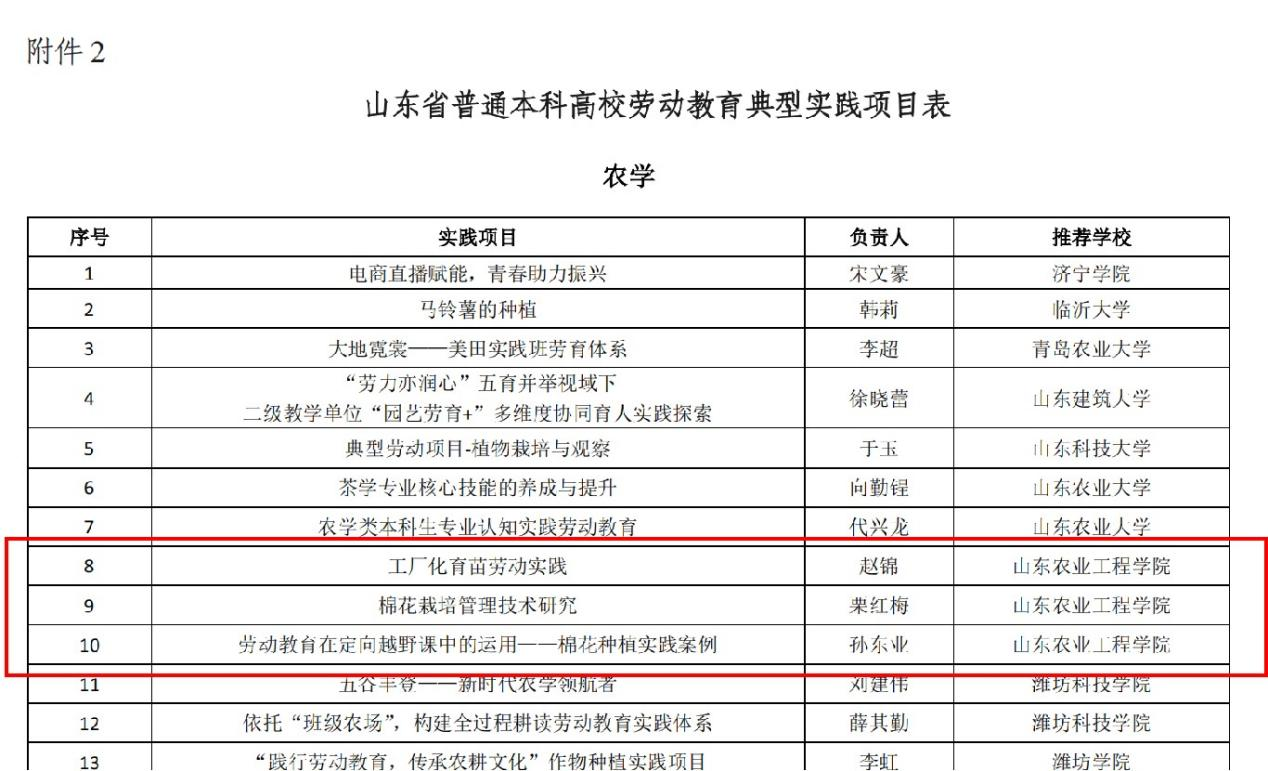 为贯彻落实中共中央、国务院《关于全面加强新时代大中小学劳动教育的意见》(中发〔2020〕7号)精神,推进劳动教育有机融入各类课程及人才培养全过程,充分发挥劳动实践在劳动教育中的关键作用,由山东省普通高等学校劳动教育教学指导委员会组织进行了本次评选,共评选不同学科门类典型教学案例97项、实践项目127项。必赢孙东文老师申报的《走出去、请进来,让大学生在劳动实践中健康成长》成功入选山东省普通本科高校劳动教育典型教学案例,赵锦老师申报的《工厂化育苗劳动实践》、栗红梅老师申报的《棉花栽培管理技术研究》和孙东业老师申报的《劳动教育在定向越野课中的运用——棉花种植实践案例》成功入选山东省普通本科高校劳动教育典型实践项目。
