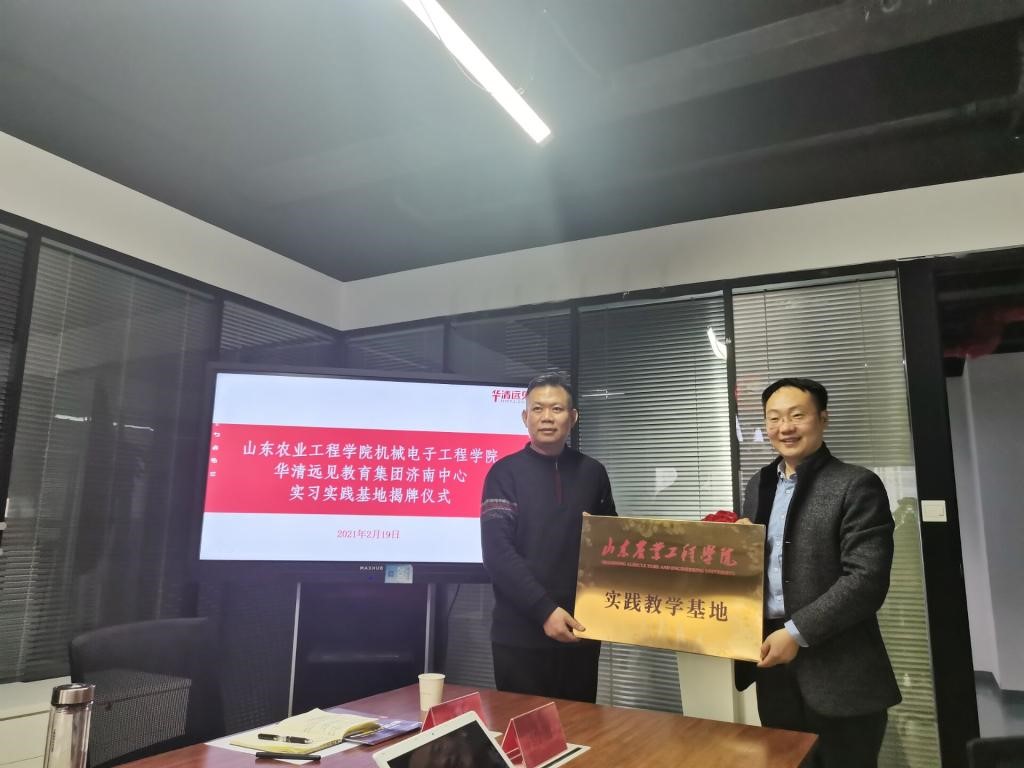 2月19日下午,机械电子工程学院实习实践基地揭牌仪式在华清远见教育集团济南中心顺利举行。机械电子工程学院院长宋卫海、副院长赵志桓、电气工程教研室主任潘莹月、副主任姜明明一行参加了揭牌仪式。