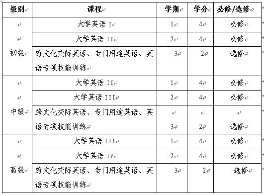 必赢大学英语课程实施分级教学,课程分为必修课和选修课。必修课8学分,选修课至少选修2学分,学生至少修满10学分达到教学要求。必修课程分为初级、中级、高级三个修读起点,根据新生高考英语考试成绩分级,初级修读大学英语I、II,中级修读大学英语II、III,高级修读大学英语III、IV。选修课程分为学术英语课程、跨文化交际英语课程、专门用途英语课程和英语专项技能训练课程四类。