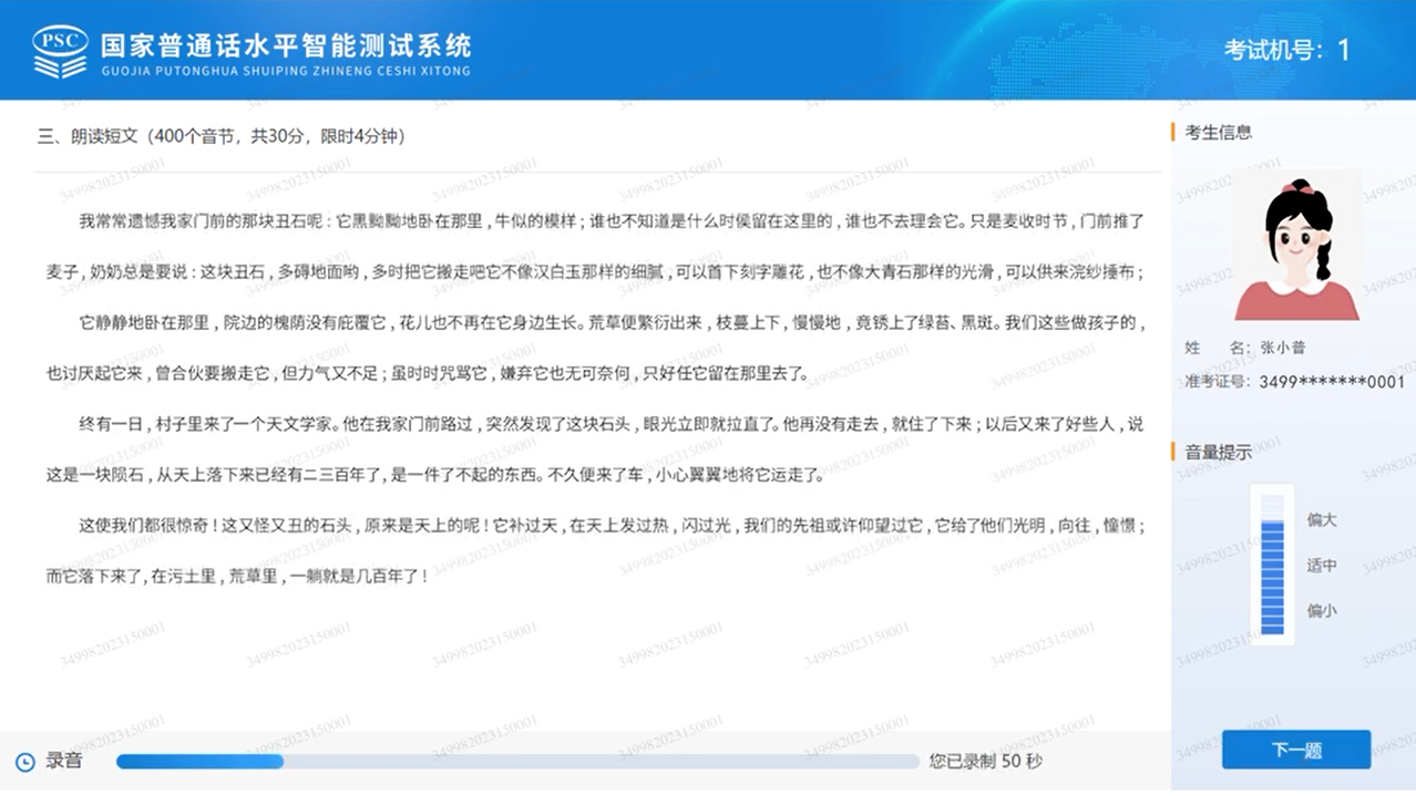 系统进入第一题提示“第一题,读单音节字词,限时3.5分钟,请横向朗读”应试人听到“嘟”声后,朗读试卷内容。