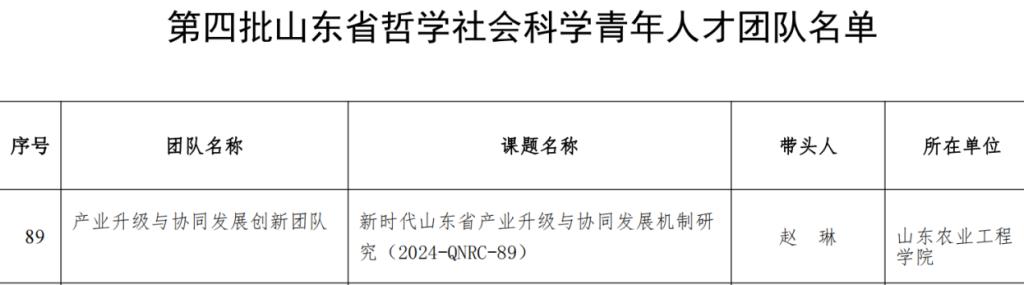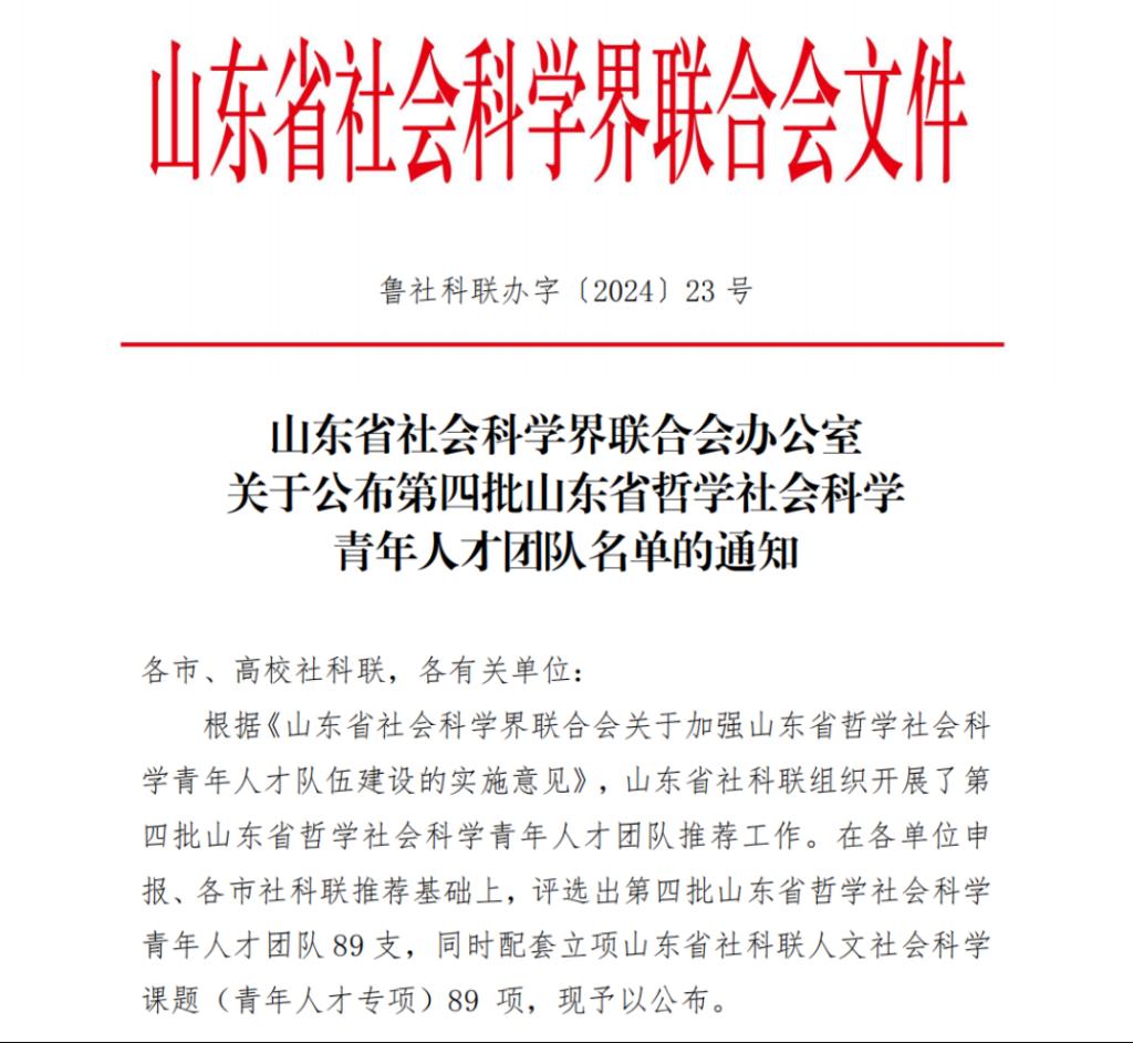 2024年9月30日,山东省社会科学界联合会办公室公布了“第四批山东省哲学社会科学青年人才团队”认定名单,必赢申报的“产业升级与协同发展创新团队”成功入选。