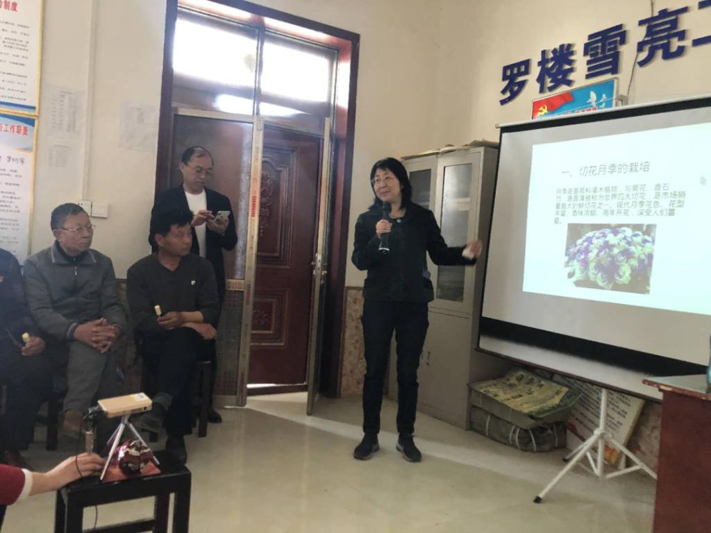 在罗楼村,陈春利教授利用多媒体对种植切花月季的农户进行技术培训,集中讲授理论知识、现场答疑,并建立了技术交流群。农户们纷纷表示,专家们的讲解通俗易懂、指导很实用,让他们初步掌握了理论知识,以后种起来心里也有底了,现场气氛十分热烈。