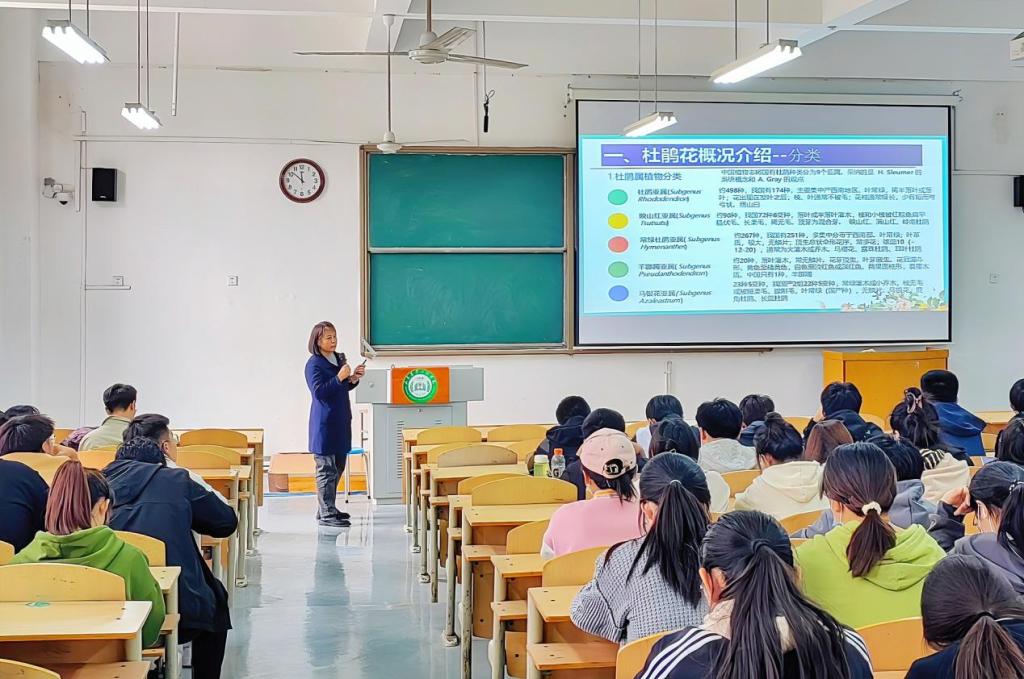 赵进红从杜鹃花的分类、自然分布状况以及国内外栽培应用等方面进行讲述。重点介绍了映山红等耐寒杜鹃特性、杜鹃苗木繁育技术及应用栽培技术三个方面。深入浅出的讲解了映山红等6种杜鹃的种植技术推广,拓展了不同品种的杜鹃在园林、临床医学等方面的应用知识。最后,赵进红立足北方生态环境实际、杜鹃生态习性与应用情况,充分展示了科研团队在植物发育与精准设计育种相关研究流域的重大进展。以宏观的视角,多方位、多角度、多层次的对杜鹃花的栽培、养护技术的提高进行展望。同学们普遍认为,本次讲座理论联系实际,既加深了对杜鹃实际应用情况的了解,又拓宽了学术视野,为今后的研究与实践奠定了坚实的基础。