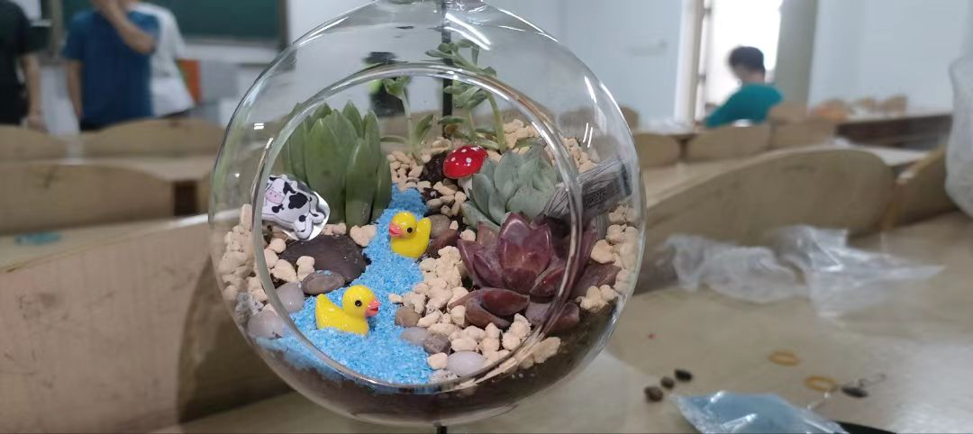 “指尖凝聚绿意,用方寸容纳美好”。同学们根据自己的设计与想象,利用提前准备好的玻璃罩、多肉植物、彩砂等材料,全情投入创作,用喜悦浇灌出美丽的“小小花园”。比赛结束后,我院组织评选小组对参赛作品进行评选,评出一等奖1组、二等奖2组、三等奖5组、优秀奖10组。