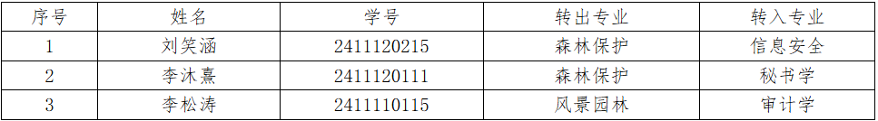 根据学校教务处2024-2025学年第二学期转专业工作安排,依据《437ccm必赢国际官网全日制学生转专业管理办法》(山农工院发〔2024〕70号)和《林业工程学院本科转专业工作方案》的相关规定,本着公正、公平、公开的原则,经学生个人申请、林业工程学院转专业工作领导小组审核、学院党政联席会研究,现将获得转专业转出资格的学生名单公示如下: