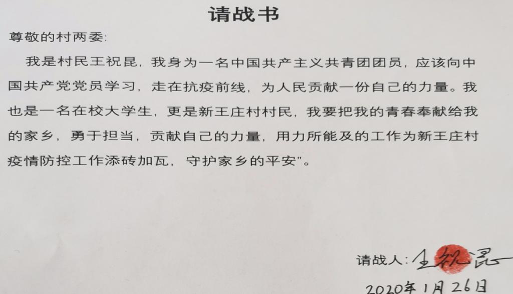 王祝昆,中国共产主义青年团团员,林业工程学院19级风景园林专业学生。他积极主动的向村委会提出参与到疫情防控的志愿者队伍中,履行职责担当。王祝昆为村民宣传疫情传播方式和防治措施;协助本村巡逻、排查、消毒等工作,阻止外村来访人员,并对村里进出人员进行体温测量、登记报表,对各家各户进行消毒。用实际行动充分诠释志愿精神,为村民筑起保卫生命健康的坚强壁垒,成为打赢疫情防疫防控阻击战的先锋力量。当有村民问起他为何参加到志愿者队伍时,他表示道:“我身为当代大学生,又是中国共产主义青年团的一员,在此疫情危急之际,应该向党员学习,响应学校号召,牢记老师教诲,为国家、为村民做出自己的贡献,承担自己的责任,守护家乡平安。”
