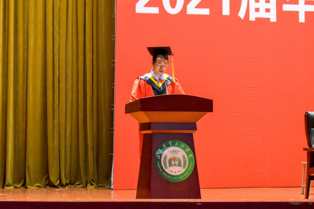 学院副院长张忠峰作为教师代表发言,他寄语毕业生,让曾经羽翼未丰的少年成长为可以独当一面的是知识和梦想,坚守心中的理想,把它融入奋斗的目标。